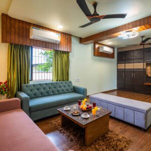 Spread across the 1st and 2nd floors, the Penthouse Suite is the crown jewel of our villa — designed for those who appreciate elevated living. Featuring three expansive river-facing king-sized bedrooms, this suite blends opulence with comfort at every corner. Attached is a spacious 350 sq ft living room equipped with a 55-inch Smart TV and a Refrigerator, perfect for relaxing or entertaining in style. Wake up to breathtaking views, unwind in your exclusive private pool, and experience the space and privacy that define true luxury. Whether you’re a couple seeking a romantic retreat or simply indulging in a lavish escape, the Penthouse Suite promises an unmatched stay marked by elegance, grandeur, and exclusivity.